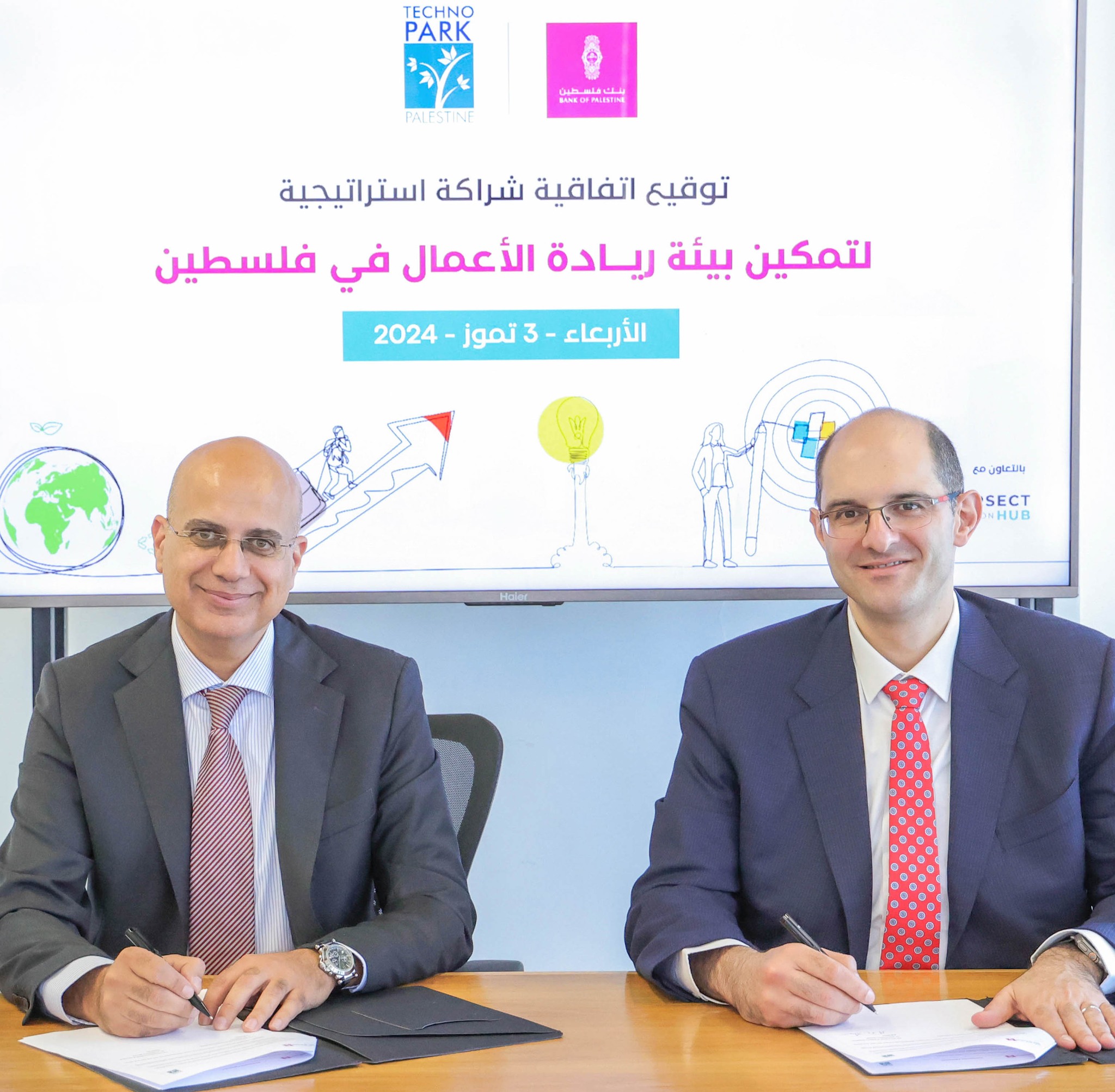 Palestine Technopark is thrilled to announce a strategic partnership with Bank of Palestine to foster a vibrant innovation ecosystem in Palestine. This initiative particularly focuses on women and youth, enhancing the technology sector to create a sustainable and thriving environment for innovative businesses in Palestine. The agreement will leverage resources and capabilities to provide opportunities for innovators and startups, both locally and internationally, through various activities, training events, creative thinking sessions, and ideation workshops. Additionally, it aims to strengthen connections with expatriate Palestinian youth through workshops, dialogue programs, and media initiatives, and develop methods for using technology and programming to assist entrepreneurs in meeting their financial needs and transactions.