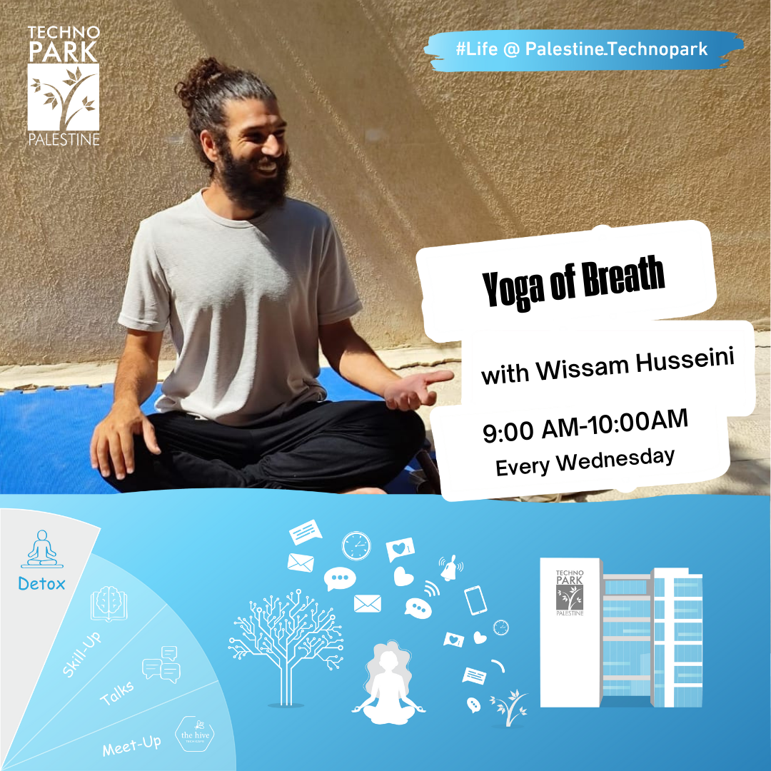 Join us for a transformative Yoga of Breath session with Wissam Husseini at Palestine TechnoPark! In today’s fast-paced world, finding a moment to breathe and reset is more important than ever. This session is designed to help you cultivate mindfulness, release stress, and embrace inner calm.